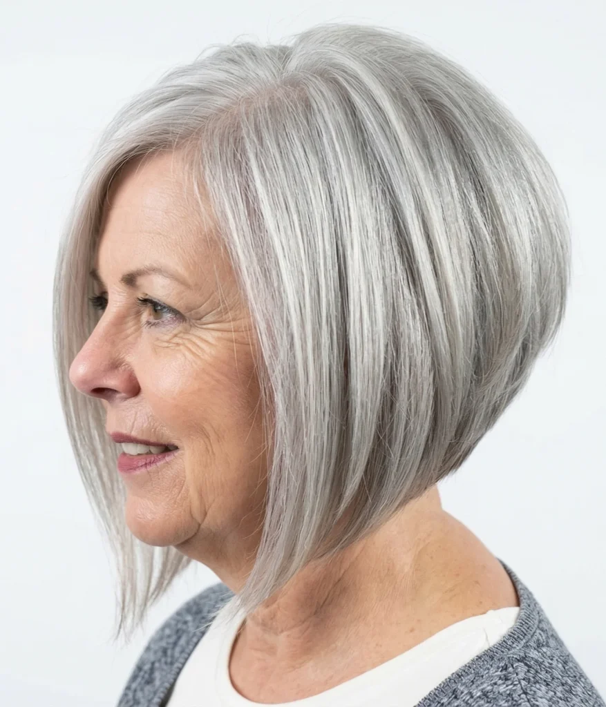 Dieser Stil unterstreicht natürliches graues oder silbernes Haar und sorgt für einen anmutigen, selbstbewussten Look.
